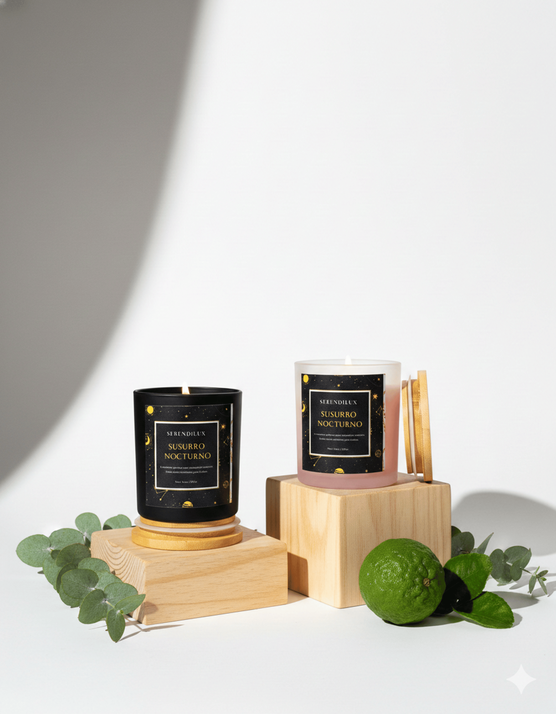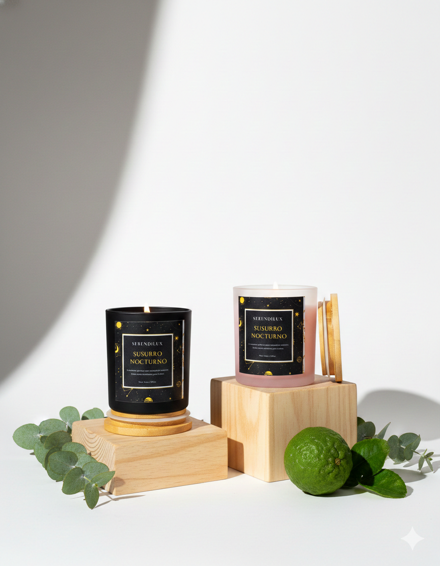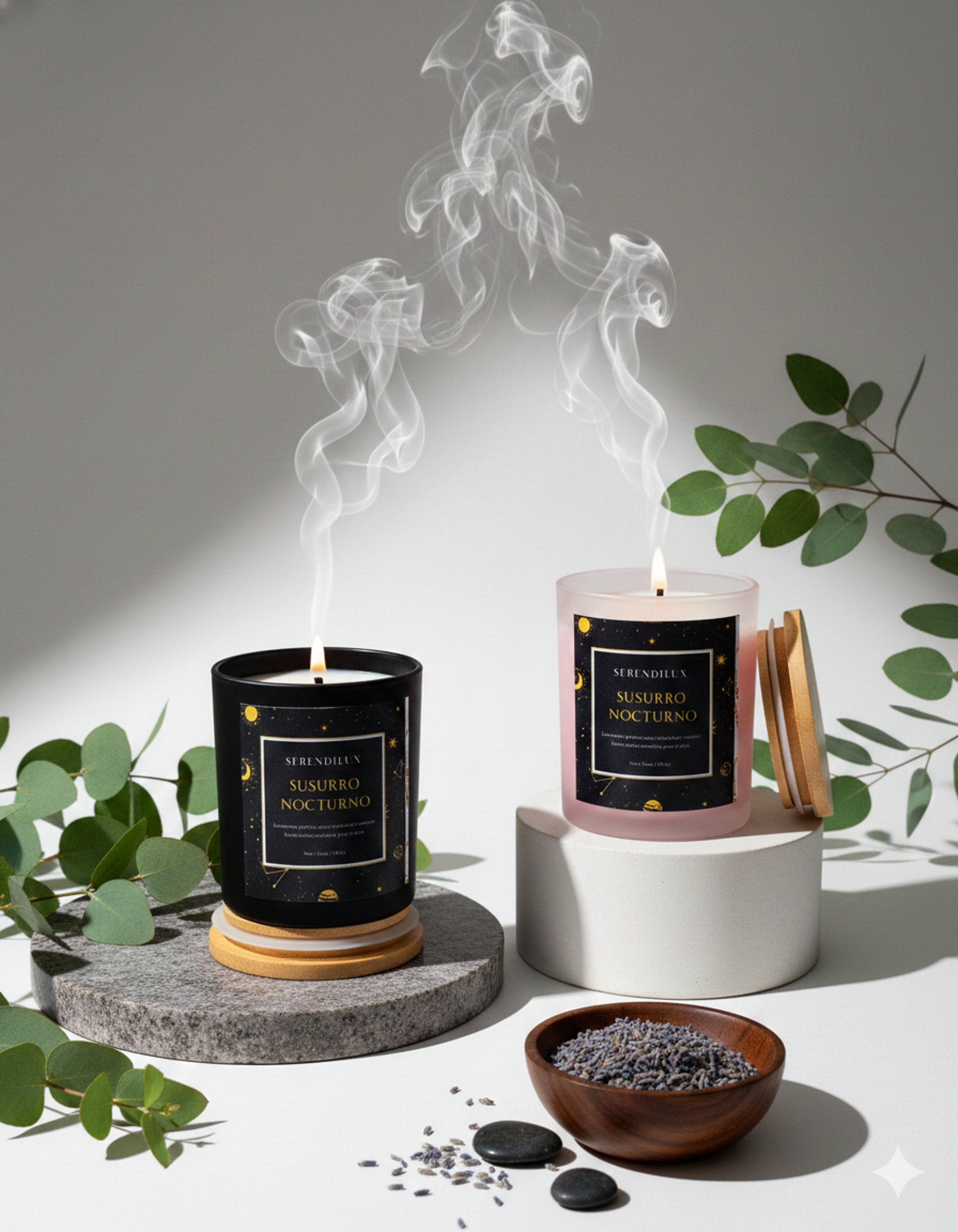 Susurro Nocturno: bergamota fresca, eucalipto limpio y un fondo de lavanda suave, acompañado de una nota de vainilla.