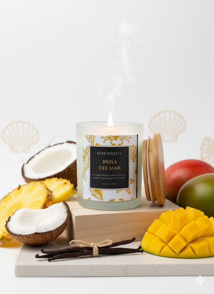 Brisa del mar: piña madura, coco cremoso y mango suave con un toque de vainilla cálida.
