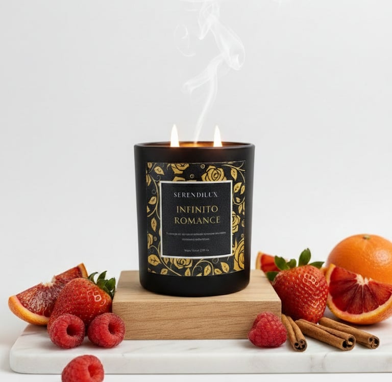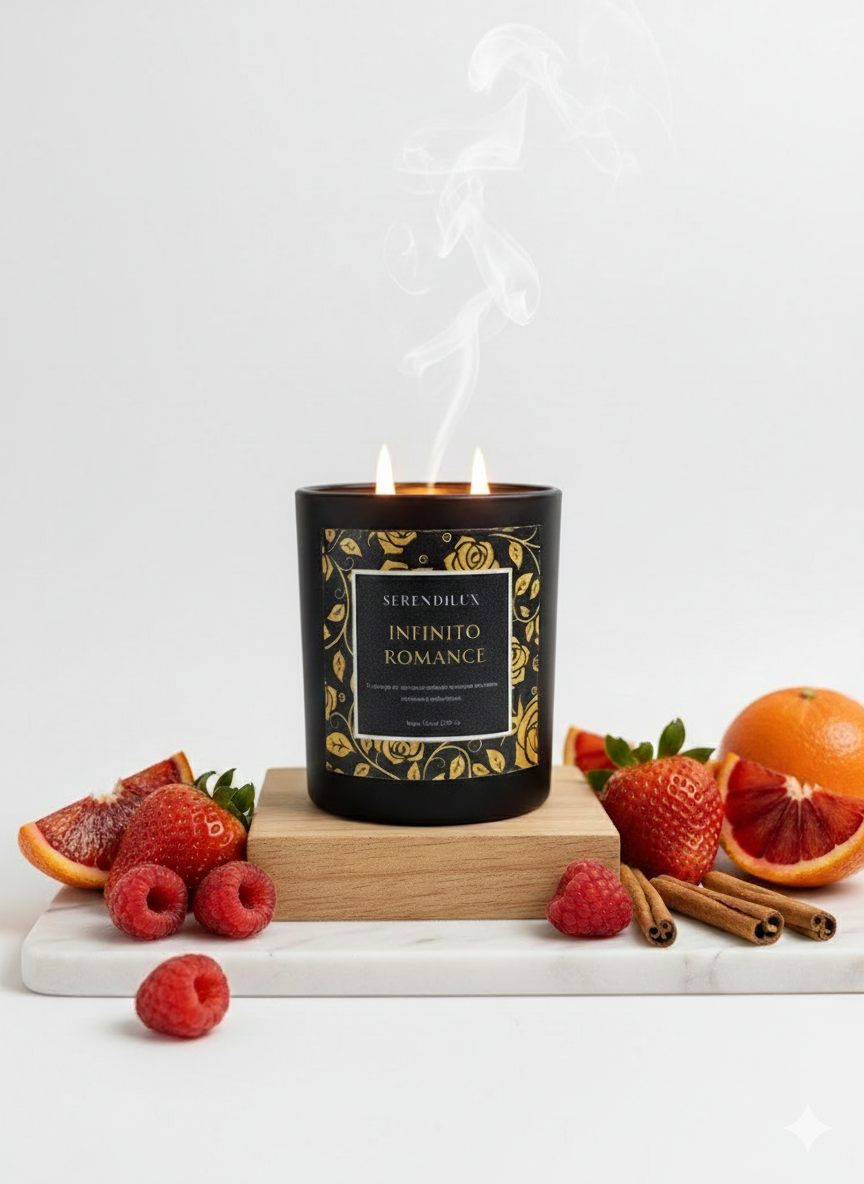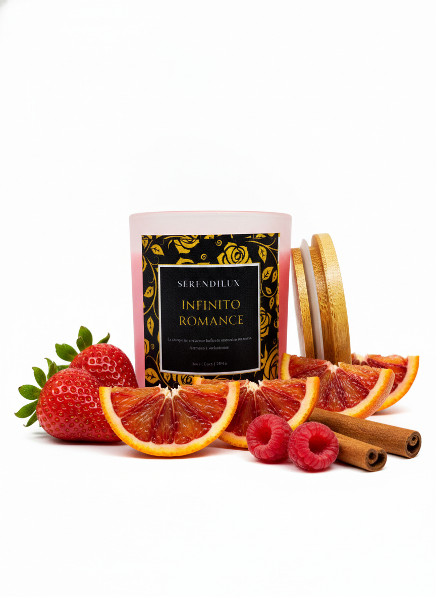 Infinito Romance: frutas rojas maduras (frambuesa y fresa), naranja moro y un delicado toque de canela.