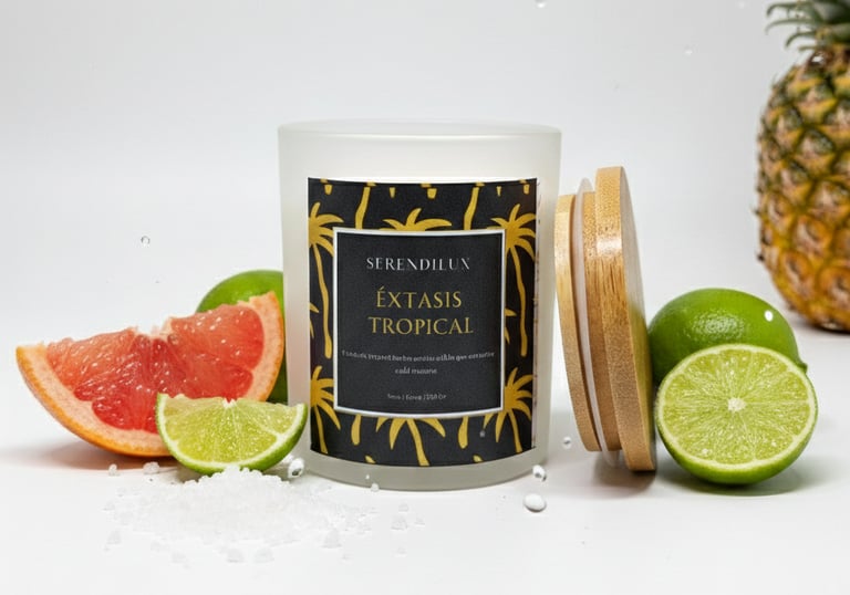 Éxtasis tropical: toronja rosada, piña jugosa, lima fresca y sal marina con un fondo cítrico exótico.